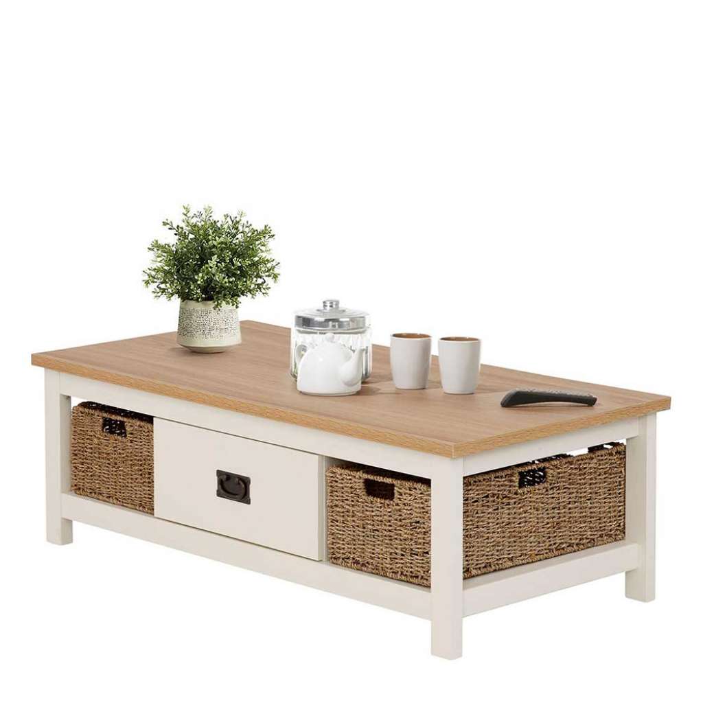 Landhaus Couchtisch in Weiß und Holz Naturfarben Rattan Körben