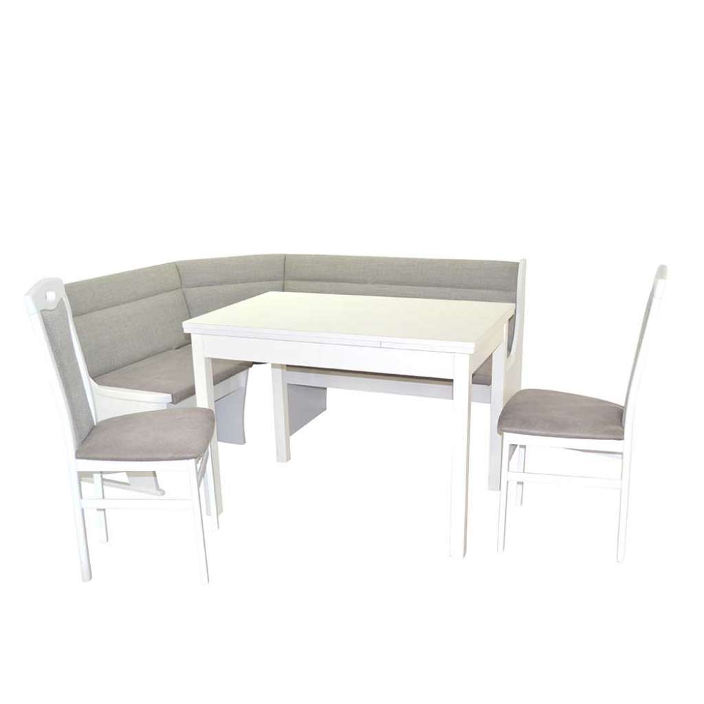 (fünfteilig) - Eckbank Gruppe 165 cm Breit, 85 cm Hoch, 125 cm Tief - Verlängerbar um je 30 cm, von 104 bis auf 164 cm - Mit Bezugsstoff aus Kunstleder und Strukturstoff (raue Oberfläche) - Beidseitig montierbar - Inklusive Eckbank - Sitzecke aus Kunstleder (100% Polyurethan), Spanplatte, Buche Massivholz und Webstoff - Eßecke in Weiß und Grau - Inklusive zwei Stühle - Esszimmer gruppe in modernem Design - Mit gepolsterter Rückenlehne - Zerlegt, zum leichten Selbstaufbau (Montageanleitung liegt bei) - Komplette essgruppe fünfteiligInformationen zur Lieferung:Die Zustellung dieses Produktes erfolgt per Spedition. Sie werden vor der Auslieferung durch die ausliefernde Spedition kontaktiert.Terminvereinbarung: Sie werden frühzeitig (ein paar Tage im Voraus) durch die ausliefernde Spedition kontaktiert und Ihnen der Auslieferzeitpunkt mitgeteilt. Die Kontaktaufnahme erfolgt per Telefon. Bei telefonischer Nichterreichbarkeit werden Sie per Postkarte über das Auslieferdatum informiert.Die Lieferung erfolgt aus Kostengründen Frei Bordsteinkante (bis zur ersten verschlossenen Tür). Für den weiteren Transport der Ware sind Sie eigenverantwortlich.Die Auslieferung erfolgt von Montags bis Freitags. Eine Zustellung an Sonn- und Feiertagen ist nicht möglich.