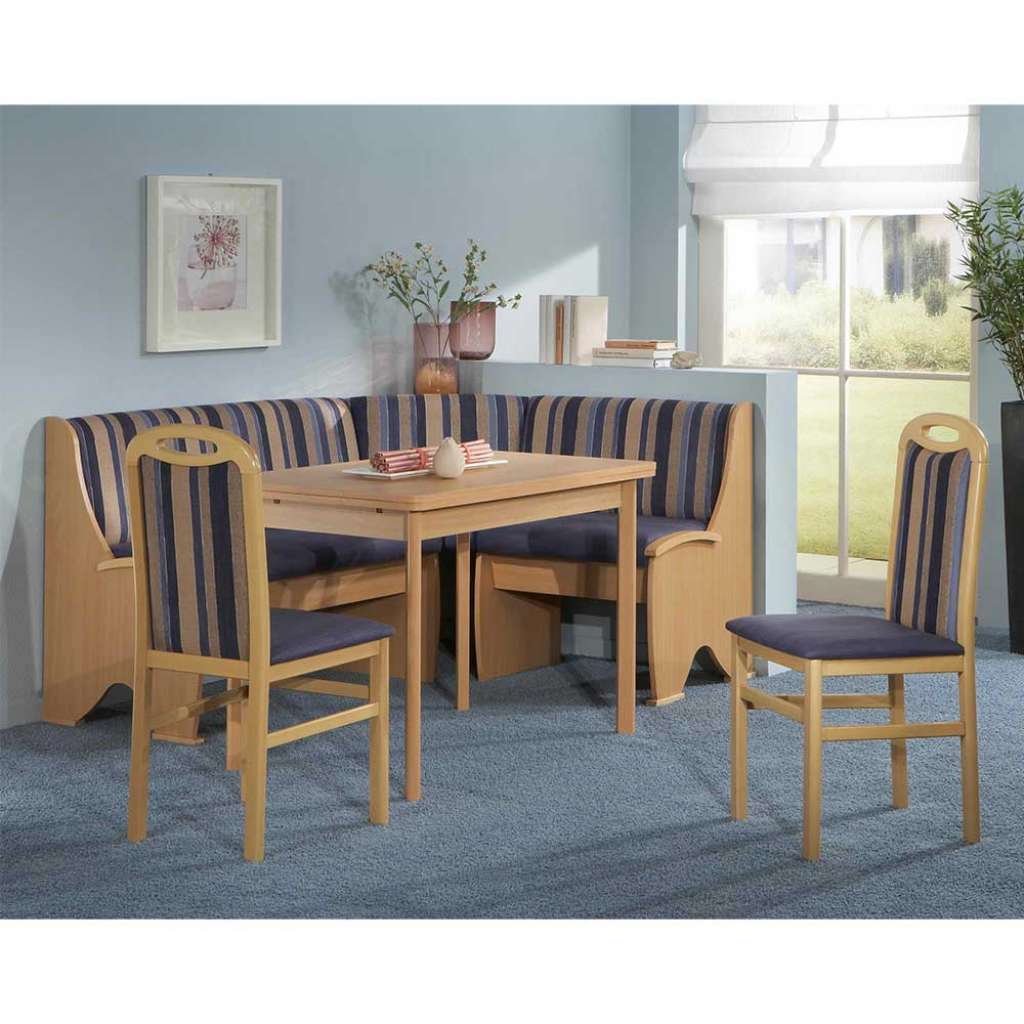 (vierteilig) - Kücheneckbankgruppe 167 cm Breit, 87 cm Hoch, 127 cm Tief - Esseck in Blau, Beige und Buchefarben - Verlängerbar um je 30 cm, von 105 bis auf 165 cm - Beidseitig montierbar - Inklusive Eckbank - Sitzecke aus Spanplatte, Microfaser und Buche Massivholz - Sitzgarnitur im klassischen Stil - Mit Bezugsstoff aus Microfaser (100% Polyester) - Inklusive zwei Stühle - Mit gepolsterter Rückenlehne - Zerlegt, zum leichten Selbstaufbau (Montageanleitung liegt bei) - VierteiligInformationen zur Lieferung:Die Zustellung dieses Produktes erfolgt per Spedition. Sie werden vor der Auslieferung durch die ausliefernde Spedition kontaktiert.Terminvereinbarung: Sie werden frühzeitig (ein paar Tage im Voraus) durch die ausliefernde Spedition kontaktiert und Ihnen der Auslieferzeitpunkt mitgeteilt. Die Kontaktaufnahme erfolgt per Telefon. Bei telefonischer Nichterreichbarkeit werden Sie per Postkarte über das Auslieferdatum informiert.Die Lieferung erfolgt aus Kostengründen Frei Bordsteinkante (bis zur ersten verschlossenen Tür). Für den weiteren Transport der Ware sind Sie eigenverantwortlich.Die Auslieferung erfolgt von Montags bis Freitags. Eine Zustellung an Sonn- und Feiertagen ist nicht möglich.