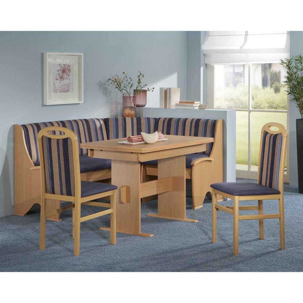 (vierteilig) - Kücheneckbankgruppe 167 cm Breit, 87 cm Hoch, 127 cm Tief - Esseck in Blau, Beige und Buchefarben - Verlängerbar um je 30 cm, von 105 bis auf 165 cm - Beidseitig montierbar - Inklusive Eckbank - Sitzecke aus Spanplatte, Buche Massivholz und Microfaser - Sitzgarnitur im klassischen Stil - Mit Bezugsstoff aus Microfaser (100% Polyester) - Inklusive zwei Stühle - Mit gepolsterter Rückenlehne - Zerlegt, zum leichten Selbstaufbau (Montageanleitung liegt bei) - VierteiligInformationen zur Lieferung:Die Zustellung dieses Produktes erfolgt per Spedition. Sie werden vor der Auslieferung durch die ausliefernde Spedition kontaktiert.Terminvereinbarung: Sie werden frühzeitig (ein paar Tage im Voraus) durch die ausliefernde Spedition kontaktiert und Ihnen der Auslieferzeitpunkt mitgeteilt. Die Kontaktaufnahme erfolgt per Telefon. Bei telefonischer Nichterreichbarkeit werden Sie per Postkarte über das Auslieferdatum informiert.Die Lieferung erfolgt aus Kostengründen Frei Bordsteinkante (bis zur ersten verschlossenen Tür). Für den weiteren Transport der Ware sind Sie eigenverantwortlich.Die Auslieferung erfolgt von Montags bis Freitags. Eine Zustellung an Sonn- und Feiertagen ist nicht möglich.