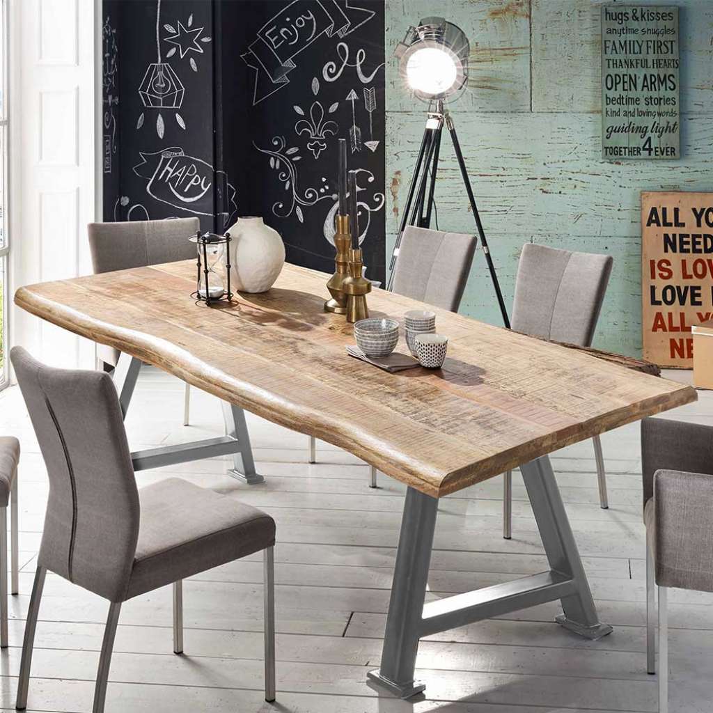 Baumkanten Esszimmertisch aus Mangobaum Massivholz und Stahl A Fußgestell