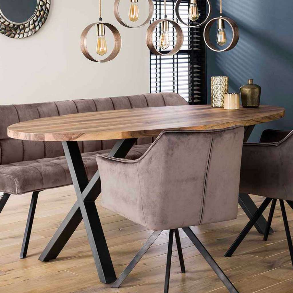 Ovaler Esszimmertisch aus Nussbaum Massivholz und Stahl X Fußgestell