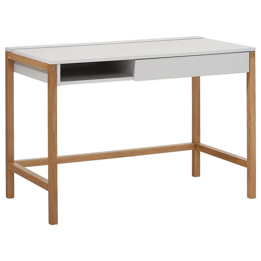 An diesem Schreibtisch mit Schublade und offenem Fach strukturieren Sie Ihren Arbeitsalltag mit skandinavisch inspiriertem Ordnungssinn. Das Design gibt mit klarer Kante die Linie vor und verbindet Natürlichkeit mit einer zeitlosen Farbgebung. So bringt das vierbeinige Gestell aus Eiche massiv den Charakter des lackierten Holzes schön zur Geltung, während die Melaminoberfläche in Hellgrau nordische Gelassenheit vermittelt. Geschlossenen Stauraum bietet die grifflose Schublade mit Vollauszug auf der rechten Seite, links daneben steht Ihnen ein offenes Fach für Unterlagen zur Verfügung. Eine Etage höher wartet das Möbel (B x T: ca. 112 x 60 cm) hinter der eigentlichen Arbeitsfläche mit einer Klappe auf. Hier verbirgt sich sogar ein Kabeldurchlass, sodass Sie die Leitungen Ihres Computer-Equipments ordentlich organisieren können. Dieser Schreibtisch mit Schublade und offenem Fach überzeugt durch ein funktionsorientiertes Gestaltungskonzept!