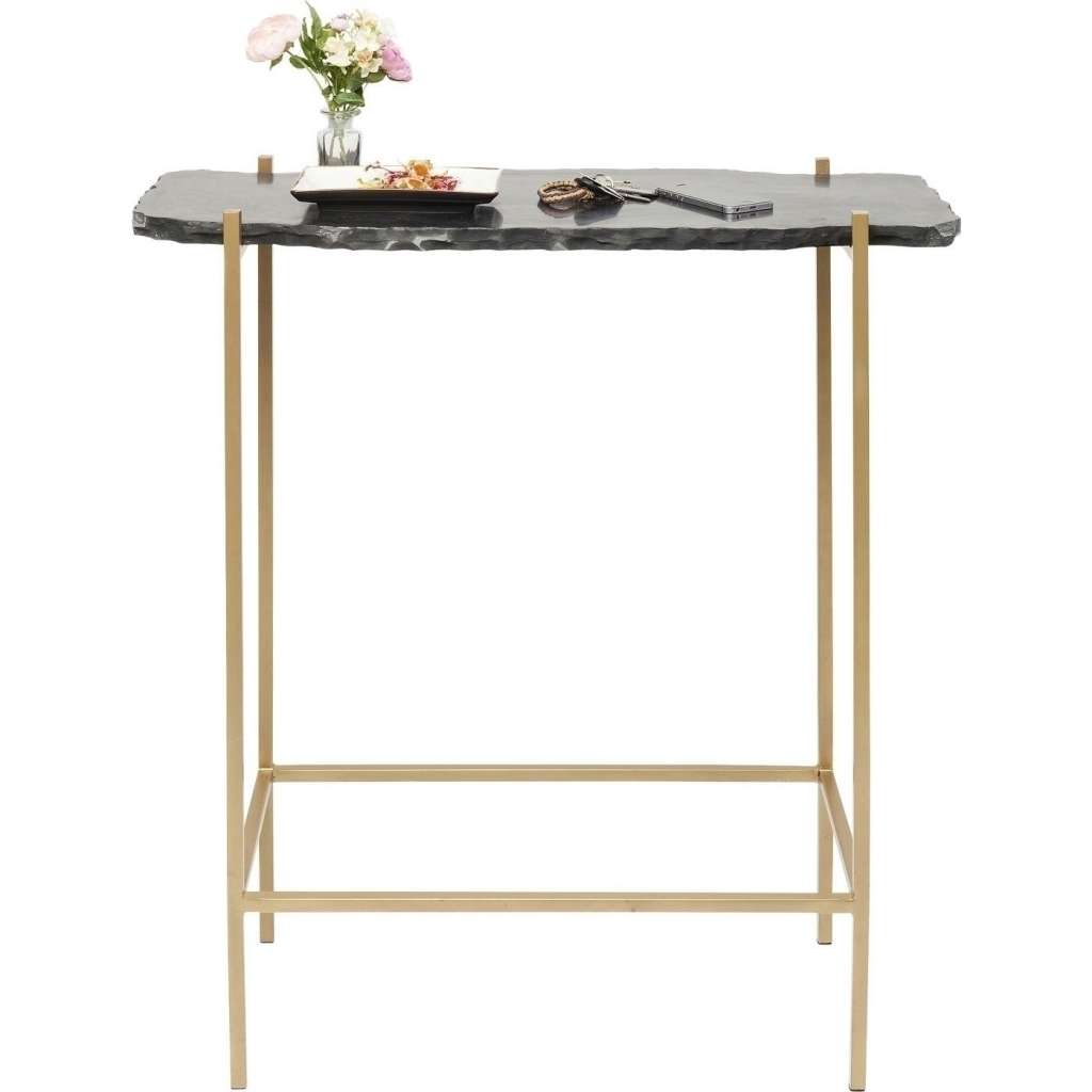Natural Glam heißt der wundervolle Wohnstil, bei dem natürliche Materialien elegant inszeniert werden. So wie bei diesem Konsolen-Tisch, dessen natürliche Steinplatte mit rauer Bruchkante auf einem sehr eleganten Gestell in Messing-Optik liegt. Weitere Varianten erhältlich.