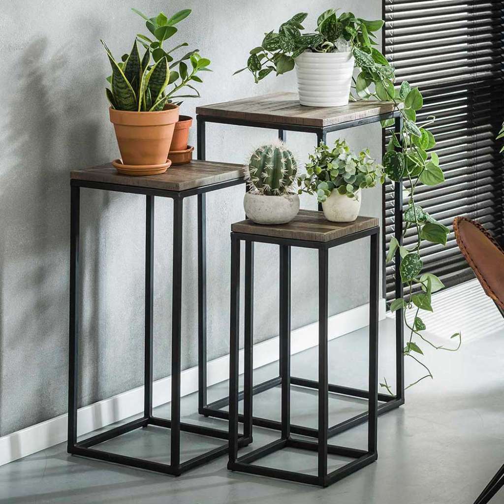 Blumentisch Set aus Teak Grey Wash massiv Metall (3-teilig)