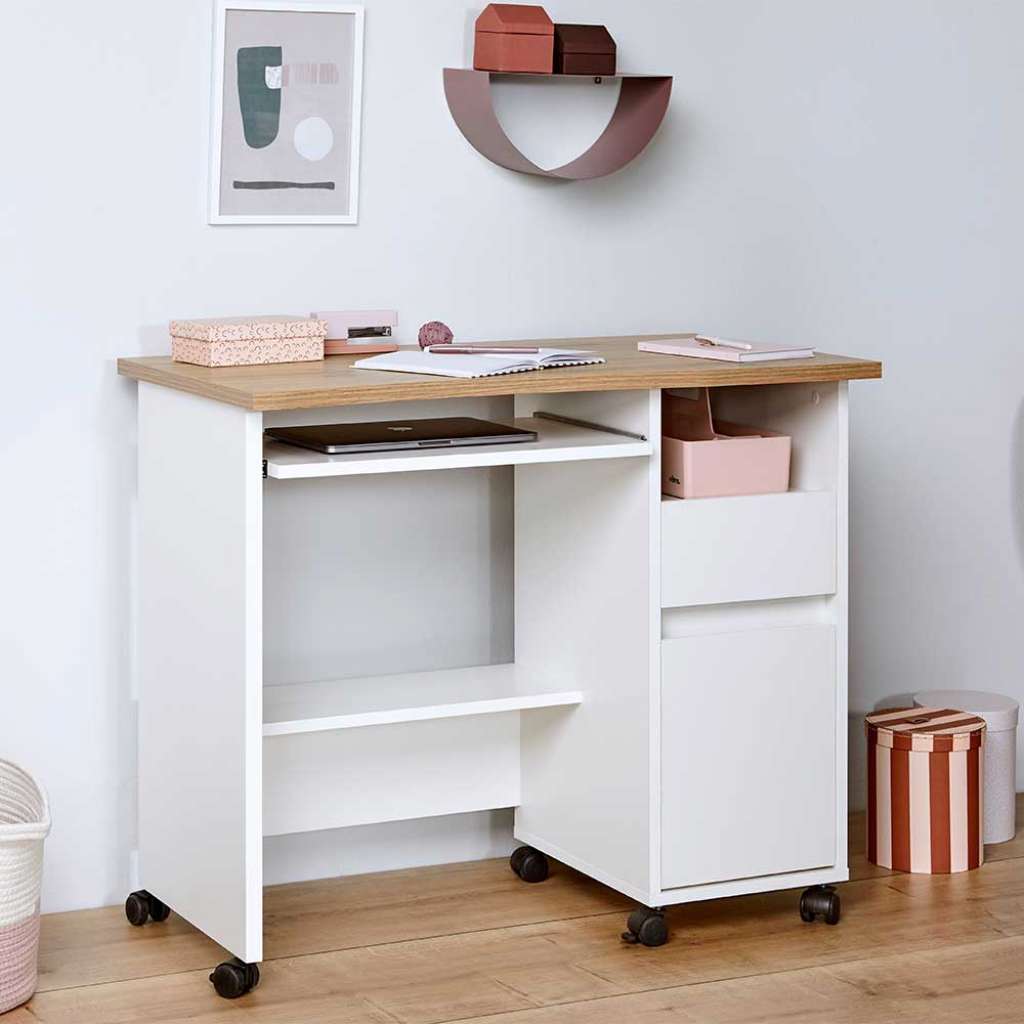 Rollen Computertisch in Weiß und Wildeiche Optik Skandi Design