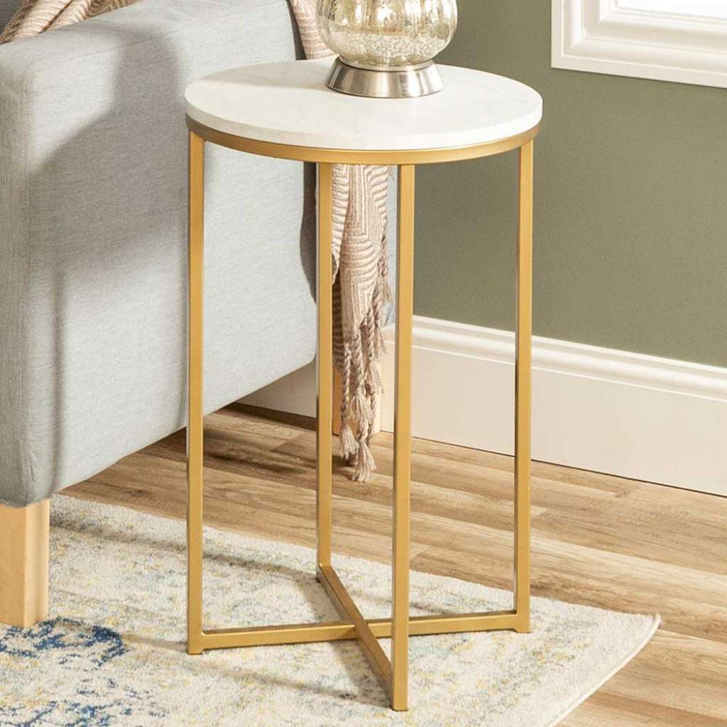 Runder Beistelltisch 41 cm Durchmesser Bügelgestell - Beistelltischchen 41 cm Breit, 62 cm Hoch, 41 cm Tief - Tisch für Wohnzimmer in Weiß, Hellgrau und Goldfarben - Foliert - Mit runder Tischplatte - Mit Bügelgestell - Telefonregal aus Metall und MDF - Tischgestell in modernem Design - Zerlegt, zum leichten Selbstaufbau (Montageanleitung liegt bei)Informationen zur Lieferung:Der Versand dieses Artikels erfolgt per DHL Paketdienst (Deutsche Post). Sollten Sie bei der Erstzustellung nicht angetroffen werden, hinterläßt der Zusteller in Ihrem Briefkasten eine Benachrichtigungskarte. Sie können die Ware dann in Ihrer Postfiliale vor Ort abholen. Die Auslieferung erfolgt von Montags bis Samstags. Eine Zustellung an Sonn- und Feiertagen ist nicht möglich.