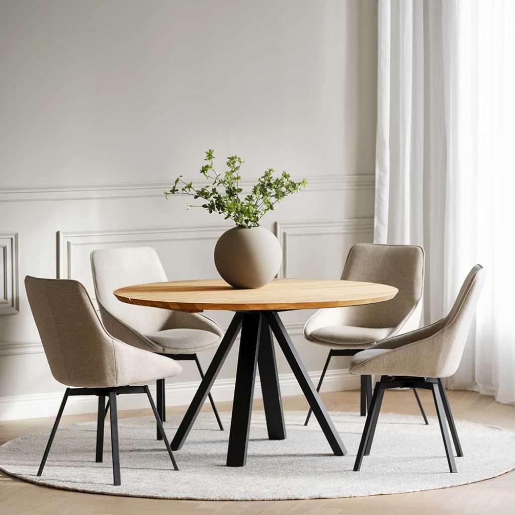 (fünfteilig) - Fünfteilig - Zerlegt, zum leichten Selbstaufbau (Montageanleitung liegt bei) - Mit gepolsterter Rückenlehne - Inklusive vier Stühle - Sitzgarnitur in modernem Design - Mit Bezugsstoff aus Webstoff - Esszimmermöbelset aus Eiche Massivholz, Metall und Webstoff - Mit Massivholz Oberfläche gebürstet und lackiert - Mit einer Bezug Strapazierfähigkeit von 25.000 Scheuertouren nach Martindale - Esszimmersitzgruppe in Eichefarben, Schwarz und Cremefarben - Tisch und Stuhl 130 cm Breit, 75 cm Hoch, 130 cm TiefInformationen zur Lieferung:Der Versand dieses Artikels erfolgt per DHL-Superservice. Dieses beinhaltet folgenden Service für Sie:Terminvereinbarung: Sie werden frühzeitig (ein paar Tage im Voraus) durch die ausliefernde Spedition kontaktiert und Ihnen der Auslieferzeitpunkt mitgeteilt. Die Kontaktaufnahme erfolgt per Telefon. Bei telefonischer Nichterreichbarkeit werden Sie per Postkarte über das Auslieferdatum informiert.Lieferung Frei Verwendungsstelle: Der Transport erfolgt an Ort und Stelle. Sie bestimmen, wohin Sie die Ware getragen haben möchten. Ob Dachgeschoss, Erdgeschoss, Schlaf- oder Wohnzimmer - die Ware wird an den von Ihnen gewünschten Ort vertragen.Zwei Speditionsfahrer vertragen die Ware: keine Mithilfe beim Entladen und Vertragen der Ware nötig. Die Speditionsfahrer sind auf den Möbeltransport spezialisiert und entsprechend geschult, somit sind Transportreklamationen nahezu ausgeschlossen.Die Auslieferung erfolgt von Montags bis Freitags. Eine Zustellung an Sonn- und Feiertagen ist nicht möglich.Alle aufgeführten Serviceleistungen sind im Artikelpreis enthalten. Es fallen keine weiteren Kosten für Sie an. Bei Insellieferungen kann nur ein reiner Abgabeservice angeboten werden - das Vertragen der Ware + Verpackungsentsorgung entfällt hierbei.