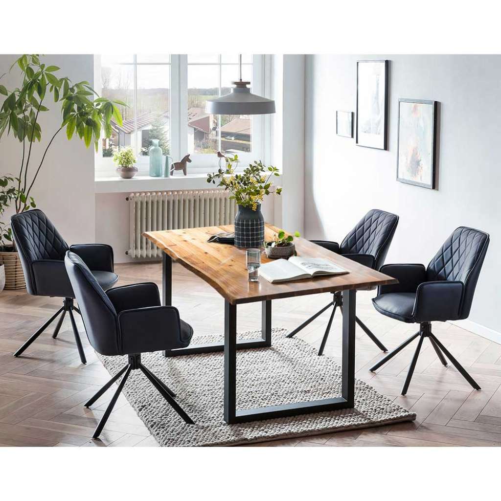 Esszimmergruppe mit Armlehnen Metall (fünfteilig) - Fünfteilig - Mit Schaumstoffpolsterung - Zerlegt, zum leichten Selbstaufbau (Montageanleitung liegt bei) - Inklusive vier Stühle - Sitzgarnitur im Industry und Loft Stil - Mit Bezug aus Microfaser (100 % Polyester) - Esszimmereinrichtung aus Microfaser, Akazie Massivholz und Metall - Mit Rautensteppung - Mit einer Bezug Strapazierfähigkeit von 50.000 Scheuertouren nach Martindale - Esszimmersitzgruppe in Dunkelblau, Cognac Braun und Schwarz - Tisch und Stuhl 77 cm HochVarianten - 001: Breite: 160 / Tiefe: 85 - 002: Breite: 180 / Tiefe: 90Informationen zur Lieferung:Der Versand dieses Artikels erfolgt per DHL-Superservice. Dieses beinhaltet folgenden Service für Sie:Terminvereinbarung: Sie werden frühzeitig (ein paar Tage im Voraus) durch die ausliefernde Spedition kontaktiert und Ihnen der Auslieferzeitpunkt mitgeteilt. Die Kontaktaufnahme erfolgt per Telefon. Bei telefonischer Nichterreichbarkeit werden Sie per Postkarte über das Auslieferdatum informiert.Lieferung Frei Verwendungsstelle: Der Transport erfolgt an Ort und Stelle. Sie bestimmen, wohin Sie die Ware getragen haben möchten. Ob Dachgeschoss, Erdgeschoss, Schlaf- oder Wohnzimmer - die Ware wird an den von Ihnen gewünschten Ort vertragen.Zwei Speditionsfahrer vertragen die Ware: keine Mithilfe beim Entladen und Vertragen der Ware nötig. Die Speditionsfahrer sind auf den Möbeltransport spezialisiert und entsprechend geschult, somit sind Transportreklamationen nahezu ausgeschlossen.Die Auslieferung erfolgt von Montags bis Freitags. Eine Zustellung an Sonn- und Feiertagen ist nicht möglich.Alle aufgeführten Serviceleistungen sind im Artikelpreis enthalten. Es fallen keine weiteren Kosten für Sie an. Bei Insellieferungen kann nur ein reiner Abgabeservice angeboten werden - das Vertragen der Ware + Verpackungsentsorgung entfällt hierbei.