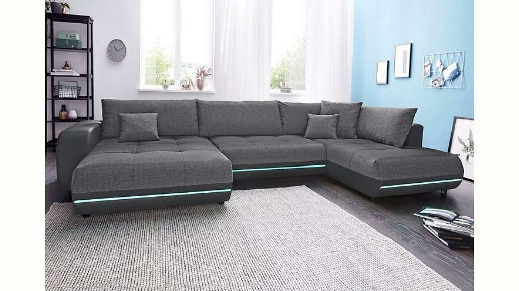 Großzügige Sitz- und Liegefläche bietet diese Wohnlandschaft, die wahlweise mit Bettfunktion und Bettkasten ausgestattet werden kann. Dann kann das Wohnzimmermöbel auch schnell in ein praktisches Bett umgewandelt werden. Lose Zier- und Rückenkissen verleihen zusätzliche Gemütlichkeit. Die bequeme Recamiere kann links oder rechts am Ecksofa bestellt werden. Die trendigen Farbkombinationen machen die Couch-Garnitur zum stylischen Blickfang im Wohnzimmer. Aufgrund der Polsterung und Federung sitzt man besonders angenehm und bequem. Hat einiges zu bieten - die Wohnlandschaft, wahlweise mit Bettfunktion und Bettkasten. mit Bettfunktion, RGB-LED-Beleuchtung