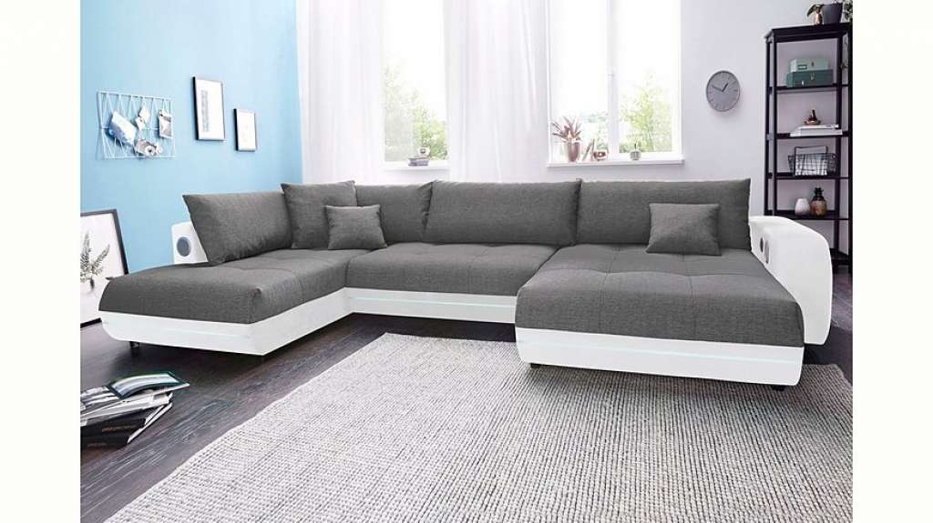 Großzügige Sitz- und Liegefläche bietet diese Wohnlandschaft, die wahlweise mit Bettfunktion und Bettkasten ausgestattet werden kann. Dann kann das Wohnzimmermöbel auch schnell in ein praktisches Bett umgewandelt werden. Lose Zier- und Rückenkissen verleihen zusätzliche Gemütlichkeit. Die bequeme Recamiere kann links oder rechts am Ecksofa bestellt werden. Die trendigen Farbkombinationen machen die Couch-Garnitur zum stylischen Blickfang im Wohnzimmer. Aufgrund der Polsterung und Federung sitzt man besonders angenehm und bequem. Hat einiges zu bieten - die Wohnlandschaft, wahlweise mit Bettfunktion und Bettkasten. RGB-LED-Beleuchtung, mit Soundsystem