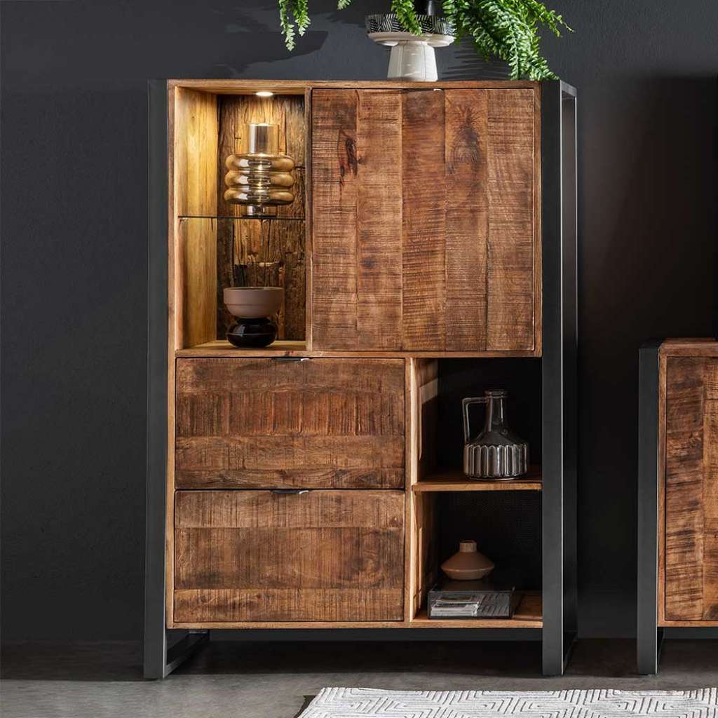 Wohnzimmer Schrank im Industrie und Loft Stil LED Beleuchtung - Schrank Holz 104 cm Breit, 150 cm Hoch, 42 cm Tief - In Mangobaum und Anthrazit - Aus Mangobaum Massivholz, Metall und Recyclingholz - Im Industry und Loft Stil - Mit Massivholz Oberfläche lackiert - Für Energieeffizienzklasse LED - Mit LED Beleuchtung - Fertig montierte Anlieferung (eventuell müssen noch Kleinteile angebracht werden) - Mit zwei Schubladen - Mit Metallgriffen - 1 türigInformationen zur Lieferung:Der Versand dieses Artikels erfolgt per DHL-Superservice. Dieses beinhaltet folgenden Service für Sie:Terminvereinbarung: Sie werden frühzeitig (ein paar Tage im Voraus) durch die ausliefernde Spedition kontaktiert und Ihnen der Auslieferzeitpunkt mitgeteilt. Die Kontaktaufnahme erfolgt per Telefon. Bei telefonischer Nichterreichbarkeit werden Sie per Postkarte über das Auslieferdatum informiert.Lieferung Frei Verwendungsstelle: Der Transport erfolgt an Ort und Stelle. Sie bestimmen, wohin Sie die Ware getragen haben möchten. Ob Dachgeschoss, Erdgeschoss, Schlaf- oder Wohnzimmer - die Ware wird an den von Ihnen gewünschten Ort vertragen.Zwei Speditionsfahrer vertragen die Ware: keine Mithilfe beim Entladen und Vertragen der Ware nötig. Die Speditionsfahrer sind auf den Möbeltransport spezialisiert und entsprechend geschult, somit sind Transportreklamationen nahezu ausgeschlossen.Die Auslieferung erfolgt von Montags bis Freitags. Eine Zustellung an Sonn- und Feiertagen ist nicht möglich.Alle aufgeführten Serviceleistungen sind im Artikelpreis enthalten. Es fallen keine weiteren Kosten für Sie an. Bei Insellieferungen kann nur ein reiner Abgabeservice angeboten werden - das Vertragen der Ware + Verpackungsentsorgung entfällt hierbei.